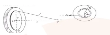 In the above figure, we can see that the disc is divided into several charged rings. Let P be the point on the axis of the disc at a distance x from the centre of the disc.