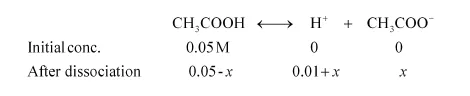 As the dissociation of a very small amount of acetic acid will take place, the values i.e., 0.05 – x and 0.01 + x can be taken as 0.05 and 0.01 respectively