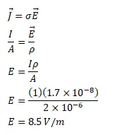 Calculate the electric field in a copper wire of cross-sectional area $2.0 \mathrm{~mm}^{2}$ carrying a current of $1 \mathrm{~A}$. The resistivity of copper $=1.7 \times 10^{-8} \Omega-\mathrm{m}$.