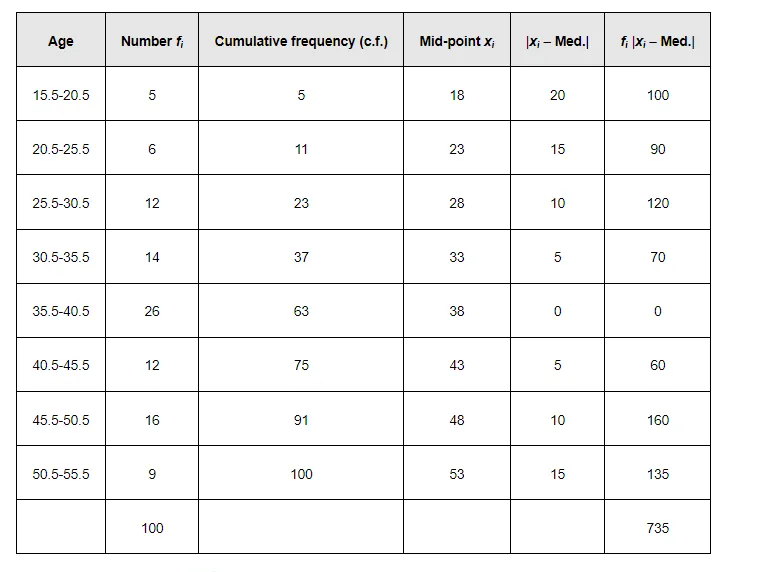 M.D. $(\mathrm{M})=\frac{1}{\mathrm{~N}} \sum_{i=1}^{8} f_{i}\left|x_{i}-\mathrm{M}\right|=\frac{1}{100} \times 735=7.35$
