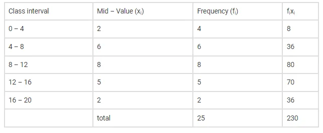 $\overline{\mathrm{X}}=\frac{\sum \mathrm{f}_{\mathrm{i}} \mathrm{x}_{\mathrm{i}}}{\sum \mathrm{f}_{\mathrm{i}}}=\frac{230}{25}=9.2$