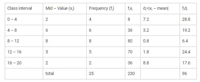 $M . D=\frac{\sum f_{i} d_{i}}{\sum f_{i}}=\frac{96}{25}=3.84$