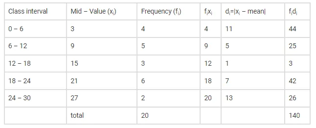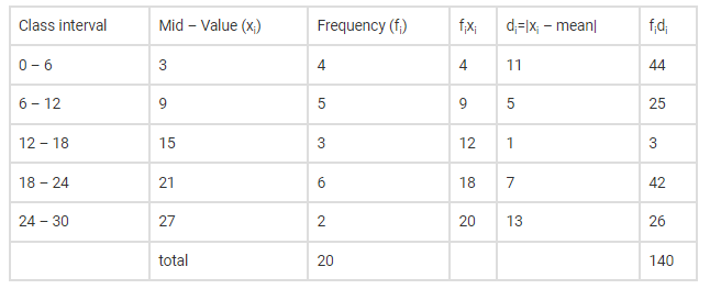 $M . D=\frac{\sum f_{i} d_{i}}{\sum f_{i}}=\frac{140}{20}=7$