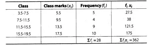 Therefore, $\bar{x}($ mean $)=\frac{\Sigma f_{i} x_{i}}{\Sigma_{j}}=\frac{362}{28}=12.93$