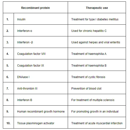 Can you list 10 recombinant proteins which are used in medical practice? Find out where they are used as therapeutics (use the internet).