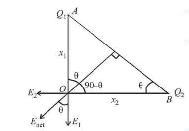 $\tan \theta=\frac{E_{2}}{E_{1}}=\frac{x_{1}}{x_{2}} \Rightarrow \frac{k Q_{2}}{x_{2}^{2} \times \frac{k Q_{1}}{x_{1}^{2}}}=\frac{x_{1}}{x_{2}}$
