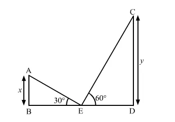 The tops of two towers of heights x and y, standing on a level ground subtend angles of 30° and 60°, respectively at the centre of the line joining their feet. Then, x : y is