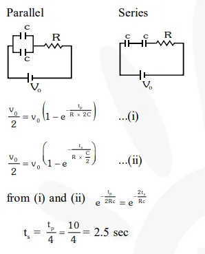 Combination of two identical capacitors, a resistor $\mathrm{R}$ and a dc voltage source of voltage 6V is used in an experiment on $(\mathrm{C}-\mathrm{R})$ circuit. It is found that for a parallel combination of the capacitor the time in which the voltage of the fully charged combination reduces to half its original voltage is 10 second. For series combination the time needed for reducing the voltage of the fully charged series combination by half is :-