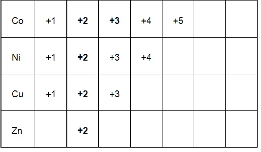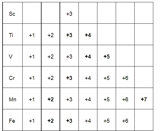 From the above table, it is evident that the maximum number of oxidation states is shown by Mn, varying from +2 to +7. The number of oxidation states increases on moving from Sc to Mn. On moving from Mn to Zn, the number of oxidation states decreases due to a decrease in the number of available unpaired electrons. The relative stability of the +2 oxidation state increases on moving from top to bottom. This is because on moving from top to bottom, it becomes more and more difficult to remove the third electron from the d-orbital.
