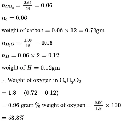 Complete combustion of $1.80 \mathrm{~g}$ of an oxygen containing compound $\left(\mathrm{C}_{\mathrm{x}} \mathrm{H}_{\mathrm{y}} \mathrm{O}_{\mathrm{z}}\right)$ gave $2.64 \mathrm{~g}$ of $\mathrm{CO}_{2}$ and $1.08 \mathrm{~g}$ of $\mathrm{H}_{2} \mathrm{O}$. The percentage of oxygen in the organic compound is: