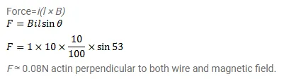 Consider a $10 \mathrm{~cm}$ long portion of a straight wire carrying a current of $10 \mathrm{~A}$ placed in a magnetic field of $0.1 \mathrm{~T}$ making an angle of $53^{\circ}$ with the wire. What magnetic force does the wire experience?