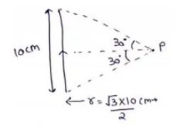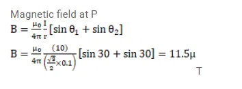 Consider a long piece of wire which carries a current of $10 \mathrm{~A}$. Find the magnitude of magnetic field due to the piece of point which makes an equilateral triangle with the ends of the piece.