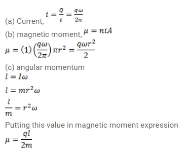Consider a nonconducting ring of radius $\mathrm{r}$ and mass $\mathrm{m}$ which has a total charge q distributed uniformly on it. The ring is rotated about its axis with an angular speed $\omega$. (a) Find the equivalent electric current in the ring, (b) find the magnetic moment $\mu$ of the ring. (c) Show that $\mu=\frac{q}{2 m} l$ where $\mid$ is the angular momentum of the ring about its axis of rotation.