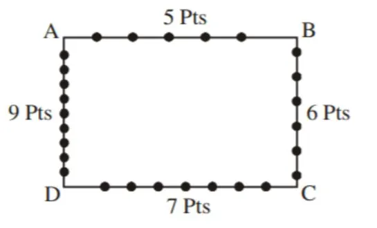 Consider a rectangle $\mathrm{ABCD}$ having $5,7,6,9$ points in the interior of the line segments $\mathrm{AB}, \mathrm{CD}, \mathrm{BC}, \mathrm{DA}$ respectively. Let $\alpha$ be the numberof triangles having these points from different sides as vertices and $\beta$ be the number of quadrilaterals having these points from different sides as vertices. Then $(\beta-\alpha)$ is equal to :