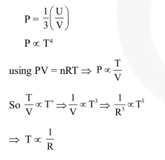 Consider a spherical shell of radius $\mathrm{R}$ at temperature $\mathrm{T}$. The black body radiation inside it can be considered as an ideal gas of photons with internal energy per unit volume $\mathrm{u}=\frac{\mathrm{U}}{\mathrm{V}} \propto \mathrm{T}^{4}$ and pressure $\mathrm{p}=\frac{1}{3}\left(\frac{\mathrm{U}}{\mathrm{V}}\right)$. If the shell now undergoes an adiabatic expansion the relation between $\mathrm{T}$ and $\mathrm{R}$ is -