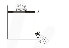Consider a water tank as shown in the figure. It's cross-sectional area is $0.4 \mathrm{~m}^{2}$. The tank has an opening $B$ near the bottom whose crosssection area is $1 \mathrm{~cm}^{2}$. A load of $24 \mathrm{~kg}$ is applied on the water at the top when the height of the water level is $40 \mathrm{~cm}$ above the bottom, the velocity of water coming out the opening $B$ is $\mathrm{v} \mathrm{ms}^{-1}$. The value of $\mathrm{v}$, to the nearest integer, is____________. [Take value of $g$ to be $10 \mathrm{~ms}^{-2}$ ]