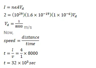 Consider a wire of length $4 \mathrm{~m}$ and cross-sectional area $1 \mathrm{~mm}^{2}$ carrying a current of $2 \mathrm{~A}$. If each cubic meter of the material contains $10^{29}$ free electrons, find the average time taken by an electron to cross the length of the wire.