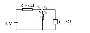 Consider an electrical circuit containing a two way switch ' $S$ '. Initially $S$ is open and then $T_{1}$ is connected to $\mathrm{T}_{2}$. As the current in $\mathrm{R}=6 \Omega$ attains a maximum value of steady state level, $T_{1}$ is disconnected from $\mathrm{T}_{2}$ and immediately connected to $\mathrm{T}_{3}$. Potential drop across $\mathrm{r}=3 \Omega$ resistor