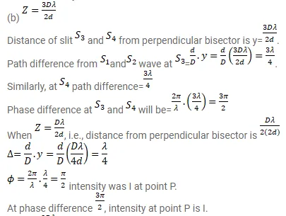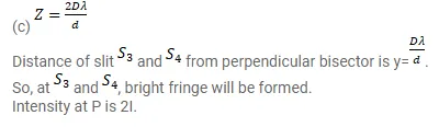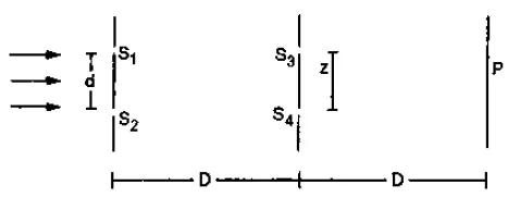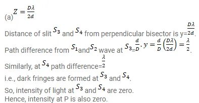 Consider the arrangement shown in figure. By some mechanism, the separation between the slits $\mathrm{S}_{3}$ and $\mathrm{S}_{4}$ can be changed. The intensity is measured at the point $\mathrm{P}$ which is common perpendicular bisector of $\mathrm{S}_{1} \mathrm{~S}_{2}$ and $\mathrm{S}_{3} \mathrm{~S}_{4}$. When $z=\frac{D \lambda}{2 d}$, the intensity measured at $P$ is $I$. Find this intensity when $z$ is equal to