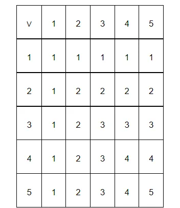 Consider the binary operation $\vee$ on the set $\{1,2,3,4,5\}$ defined by $a \vee b=\min \{a, b\}$. Write the operation table of the operation $v$.