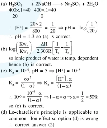 (c) A monobasic acid with $\mathrm{K}_{\mathrm{a}}=10^{-5}$ has a $\mathrm{pH}=5$. The degree of dissociation of this acid is $50 \%$.