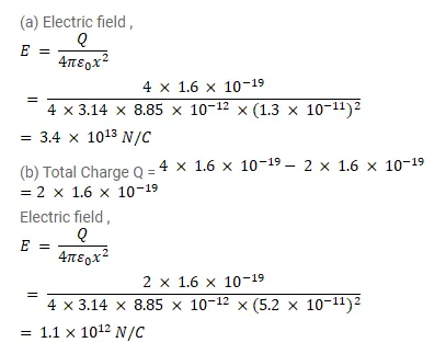Consider the following very rough model of a beryllium atom. The nucleus has four protons and four neutrons confined to a small volume of radius $10^{-15} \mathrm{~m}$. The two $1 \mathrm{~s}$ electrons make a spherical charge cloud at an average distance of $1.3 \times 10^{-11} \mathrm{~m}$ from the nucleus, whereas the two 2 s electrons make another spherical cloud at an average distance of $5.2 \times 10^{-11} \mathrm{~m}$ from the nucleus. Find the electric field at (a) a point just inside the $1 \mathrm{~s}$ cloud and (b) a point just inside the $2 \mathrm{~s}$ cloud.
