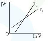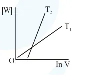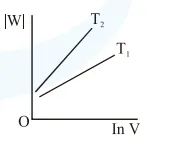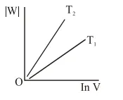 Consider the reversible isothermal expansion of an ideal gas in a closed system at two different temperatures $\mathrm{T}_{1}$ and $\mathrm{T}_{2}\left(\mathrm{~T}_{1}<\mathrm{T}_{2}\right)$. The correct graphical depiction of the dependence of work done (w) on the final volume (V) is: