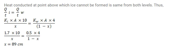 Consider the situation of the previous problem. Assume that the temperature of the water at the bottom of the lake remains constant at $4^{\circ} \mathrm{C}$ as the ice forms on the surface (the heat required to maintain the temperature of the bottom layer may come from the bed of the lake). The depth of the lake is $1.0 \mathrm{~m}$. Show that the thickness of the ice formed attains a steady state maximum value. Find this value. The thermal conductivity of water $=0.50 \mathrm{~W} / \mathrm{m}-{ }^{\circ} \mathrm{C}$ Take other relevant data from the previous problem.