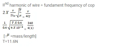 Consider the situation shown in figure. The wire which has a mass of $4.00 \mathrm{~g}$ oscillates in its second harmonic and sets the air column in the tube into vibrations in its fundamental mode. Assuming that the speed of sound in air is $340 \mathrm{~m} \mathrm{~s}^{-1}$, find the tension in the wire.