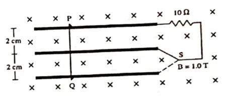 Consider the situation shown in figure. The wire PQ has a negligible resistance and is made to slide on the three rails with a constant speed of $5 \mathrm{~cm} / \mathrm{s}$. Find the current in the $10 \Omega$ resistor when the switch $\mathrm{S}$ is thrown to
