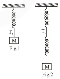 Consider two identical springs each of spring constant $\mathrm{k}$ and negligible mass compared to the mass $M$ as shown. Fig.1 shows one of them and Fig. 2 shows their series combination. The ratios of time period of oscillation of the two SHM is $\frac{T_{b}}{T_{a}}=\sqrt{x}$, where value of $x$ is