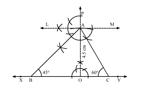 Construct a ∆ABC in which ∠B = 45°, ∠C = 60° and the perpendicular from the vertex A to base BC is 4.5 cm.