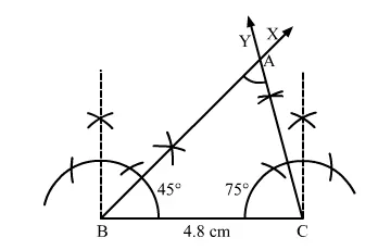 Construct a ΔABC in which BC = 4.8 cm, ∠B = 45° and ∠C = 75°. Measure ∠A.