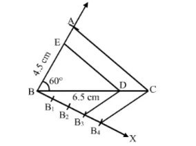 Construct a $\triangle A B C$, in which $B C=6.5 \mathrm{~cm}, A B=4.5 \mathrm{~cm}$ and $\angle A B C=60^{\circ}$. Construct a triangle similar to this triangle whose sides are $\frac{3}{4}$ the corresponding sides of $\triangle A B C$.