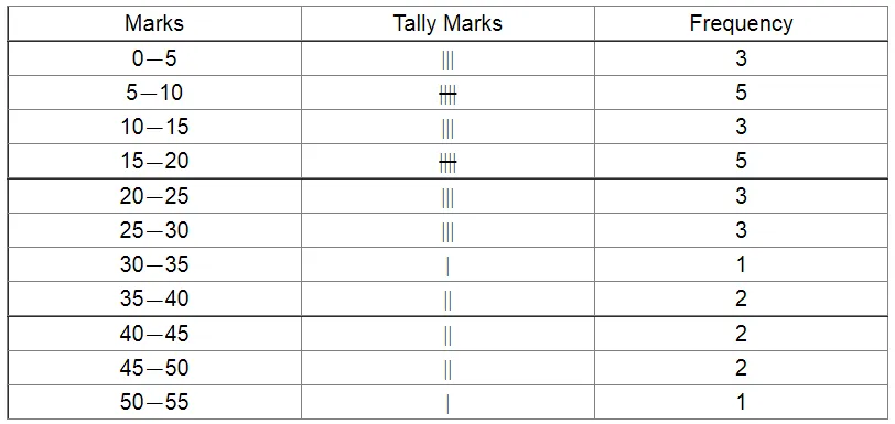 The frequency table with class intervals $0-5,5-10,10-15, \ldots, 50-55$ is given below: