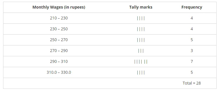 Construct a frequency table with equal class intervals from the following data on the monthly wages (in rupees) of 28 laborers working in a factory, taking one of the class intervals as 210 – 230 (230 not included).
