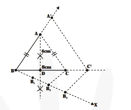 1. Construct isosceles $\triangle \mathrm{ABC}$ such that $\mathrm{BC}=8 \mathrm{~cm}$ and altitude $\mathrm{AD}=4 \mathrm{~cm}$.