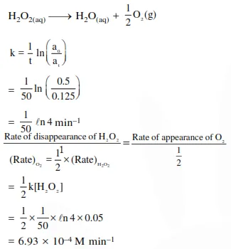 Decomposition of $\mathrm{H}_{2} \mathrm{O}_{2}$ follows a first order reaction. In fifty minutes the concentration of $\mathrm{H}_{2} \mathrm{O}_{2}$ decreases from $0.5$ to $0.125 \mathrm{M}$ in one such decomposition. When the concentration of $\mathrm{H}_{2} \mathrm{O}_{2}$ reaches $0.05 \mathrm{M}$, the rate of formation of $\mathrm{O}_{2}$ will be :-
