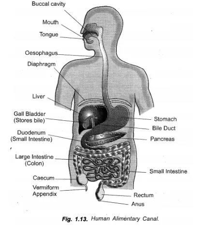 absorption. It is about 9 metres in length. Alimentary canal consists of mouth, buccal cavity, oesophagus, stomach, small intestine, large intestine