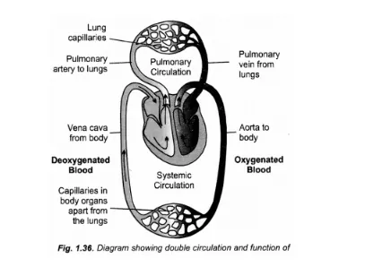 It is passage of the same blood twice through the heart first on the right side, then on the left side in order to complete one cycle. Double circulation has two components, pulmonary circulation and systemic circulation.
