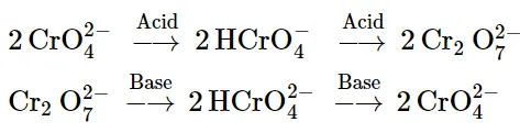 The dichromate ion $\left(\mathrm{Cr}_{2} \mathrm{O}_{7}^{2-}\right)$ exists in equilibrium with chromate $\left(\mathrm{CrO}_{4}^{2-}\right)$ ion at $\mathrm{pH} 4$. However, by changing the $\mathrm{pH}$, they can be interconverted.