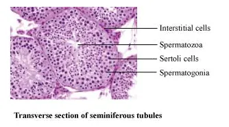 The production of sperms in the testes takes place in a highly coiled structure called the seminiferous tubules. These tubules are located in the testicular lobules. Each seminiferous tubule is lined by germinal epithelium. It is lined on its inner side by two types of cells namely spermatogonia and sertoli cells respectively. Spermatogonia are male germ cells which produce primary spermatocytes by meiotic divisions. Primary spermatocytes undergo further meiotic division to form secondary spermatocytes and finally, spermatids. Spermatids later metamorphoses into male gametes called spermatozoa. Sertoli cells are known as nurse cells of the testes as they provide nourishment to the germ cells. There are large polygonal cells known as interstitial cells or leydig cells just adjacent to seminiferous tubules. These cells secrete the male hormone called testosterone.