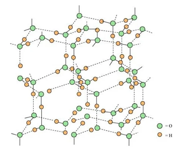 The structure is highly ordered and has hydrogen bonding. Each oxygen atom is surrounded tetrahedrally by four other oxygen atoms at a distance of 276 pm. The structure also contains wide holes that can hold molecules of appropriate sizes interstitially.