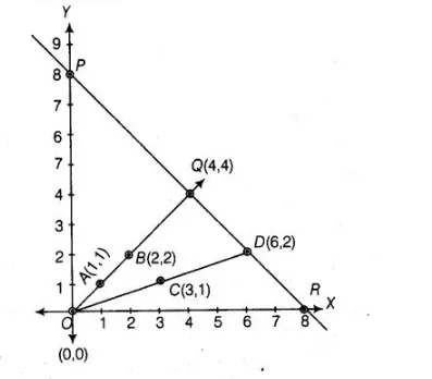 points P(0, 8), Q(4, 4) and R{8, 0), we get the straight line PQR. We see that lines AB and CD intersecting the line PR on Q and D, respectively.