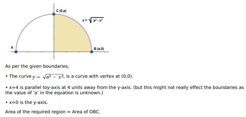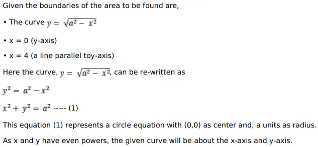 Determine the area under the curve $y=\sqrt{a^{2}-x^{2}}$, included between the lines $x=0$ and $x=4$.