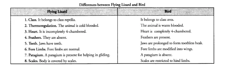 Differentiate between flying Lizard and Bird. Draw the diagram.