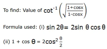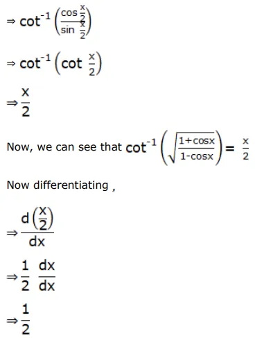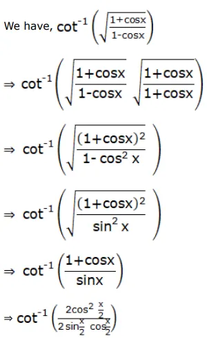 $\cot ^{-1}\left(\sqrt{\frac{1+\cos x}{1-\cos x}}\right)$