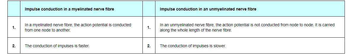 (b) impulse conduction in a myelinated nerve fibre and unmyelinated nerve fibre