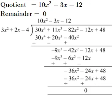 Divide 30x4 + 11x3 − 82x2 − 12x + 48 by 3x2 + 2x − 4 and find the quotient and remainder.