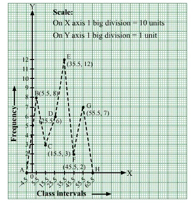 We draw line segments AB, BC, CD, DE, EF, FG, GH to obtain the required frequency polygon, as shown below.